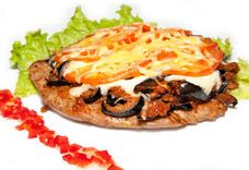 250 г • Отбивная из свиной вырезки запеченная с баклажаном, томатами, грецким орехом и чесноком под сыром