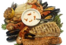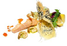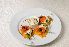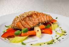 200 г • Филе семги с королевскими креветками в сливочном соусе, с красной икрой