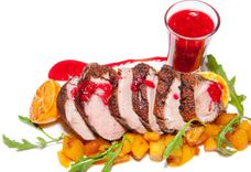 300 г • Утиная грудка с манго, мандаринами и малиновым соусом
